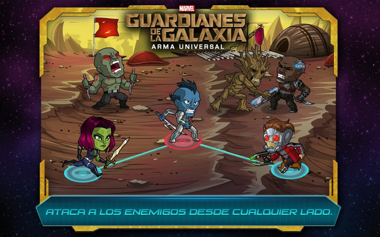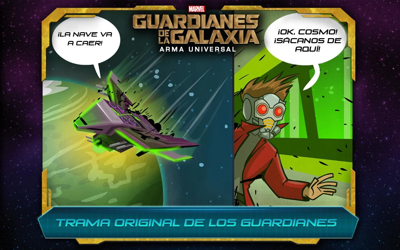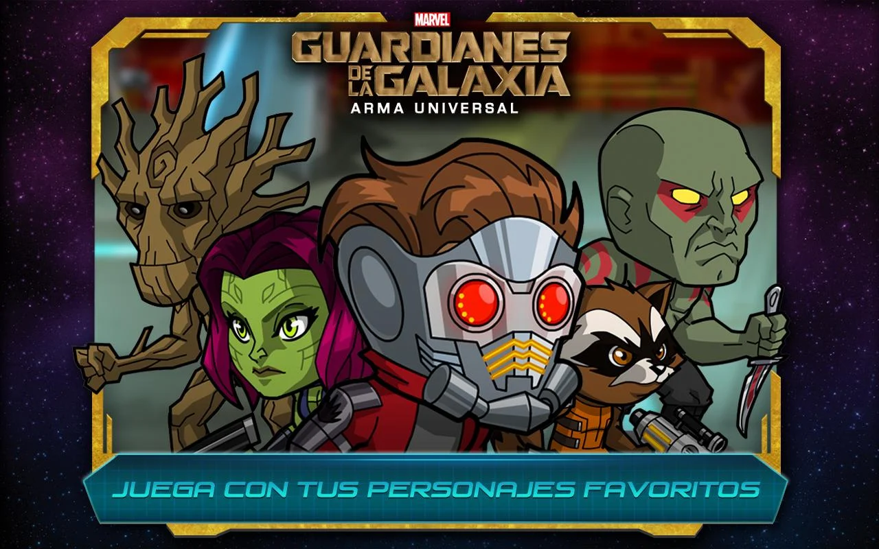 Únete a Star-Lord, Rocket, Groot, Gamora y Drax en una aventura totalmente nueva, Marvel Guardianes de la Galaxia: El Arma Universal. ¡Sé parte de la batalla para ayudar a los Guardianes a recuperar las cinco piezas del Arma Universal y evitar que caiga en manos del malvado Ronan el Acusador!